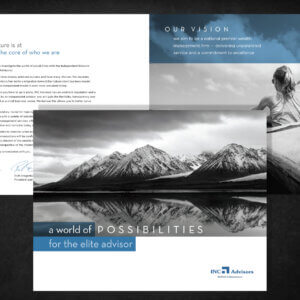 In creating this unique piece, the Barnett team promotes INC Advisor’s proven leadership, culture of excellence, and proprietary growth model. Dramatic black and white imagery, aspirational messaging, and a clean, contemporary layout work together to tell a compelling story of opportunity and partnership. The result is a piece that is both high-end and approachable, reflecting INC Advisors’ commitment to empowering independent advisors, and their private clients, to thrive.