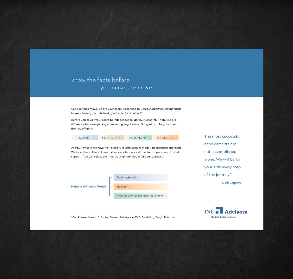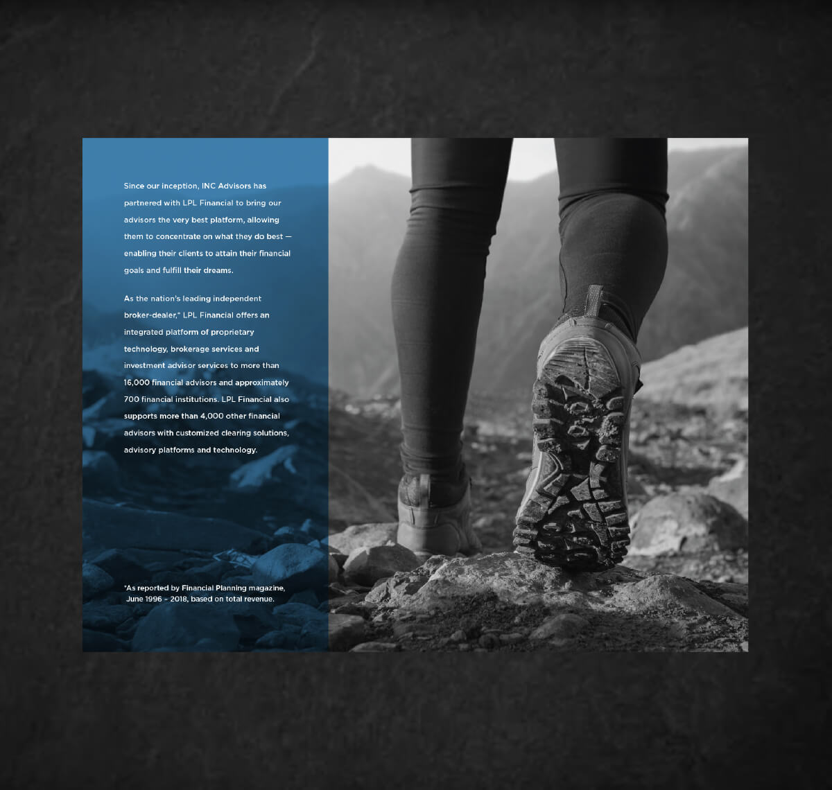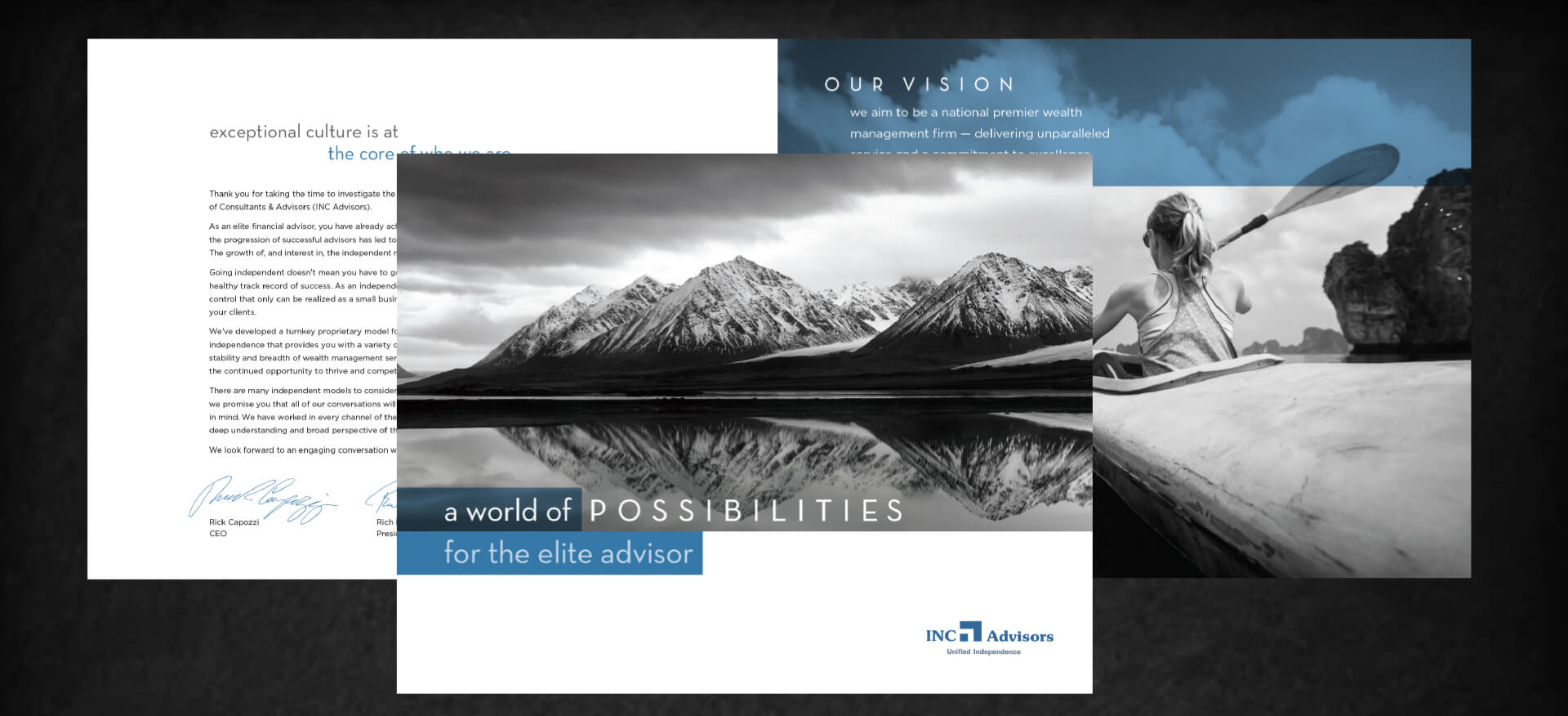 When INC Advisors approached Barnett to design their elite recruitment brochure, the goal was clear: capture the sophistication and strength of a firm built for high net worth-oriented financial advisors. As one of the largest LPL Financial enterprises, INC Advisors offers the best combination of true independence backed by hands-on, personalized support.